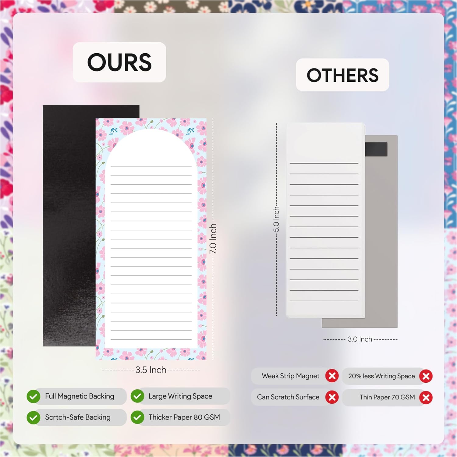 - PREMIUM SHEETS - 8 magnetic memo pads measure 7.5" Height x 3.5'' Width in inches, ideal size sheets for comfortable writing. Contains 25 sheets per pad, sheets made with high quality thick 80 GSM uncoated paper, great for writing with less chance of ink bleed through. 8 gorgeous Floral themes, total 8 unique note pads magnetic.