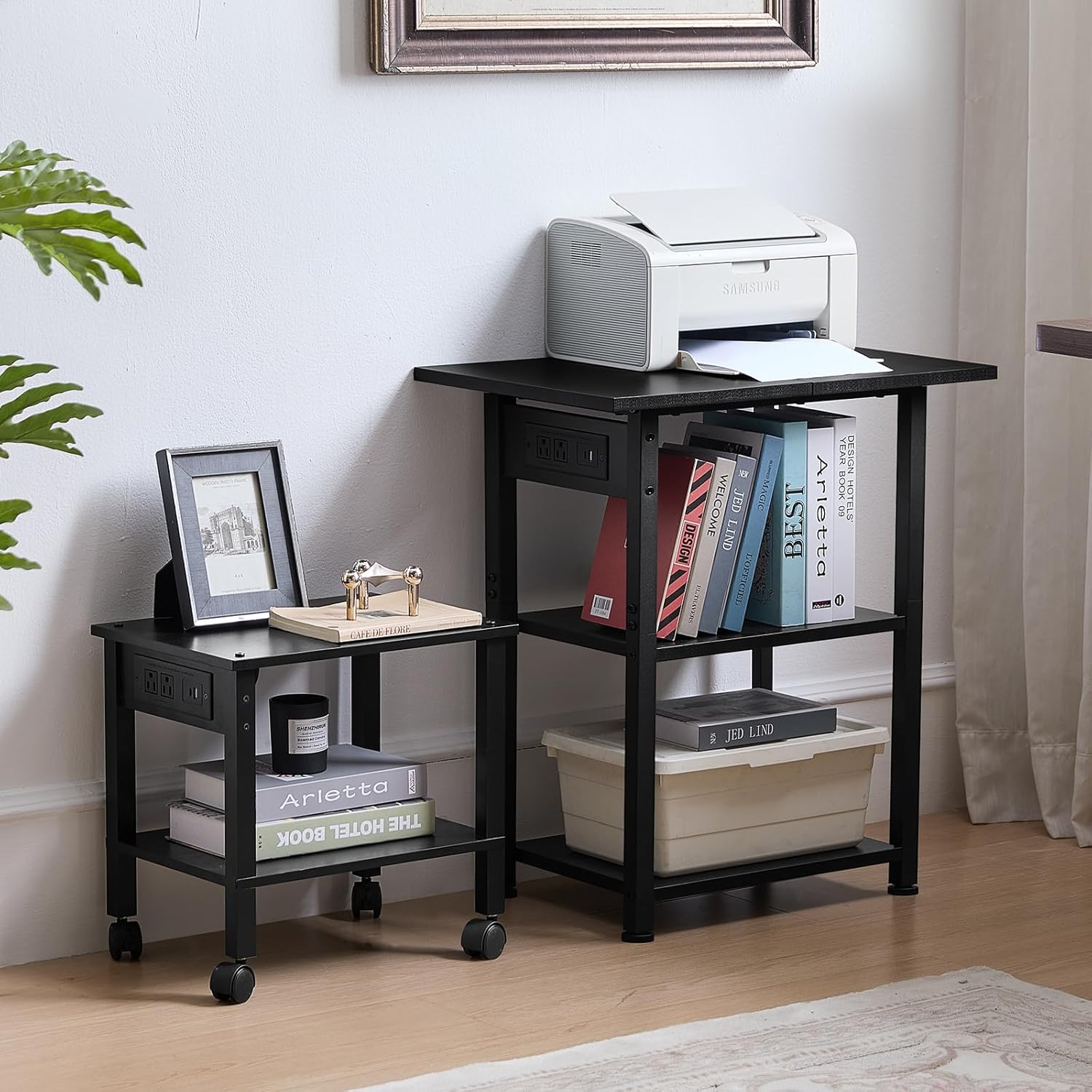 - 【Printer stand with Charging Station】The printer stand has 2 standard plug outlets, 1 USB interface and 1 Type-C interface, which can charge printers and other office equipment simultaneously. The Lerliuo printer stand's spacious top tabletop and bottom shelf provide extra space, which is flexible and convenient to free up more workspace, thus keeping the desktop tidy and creating a more comfortable working environment.