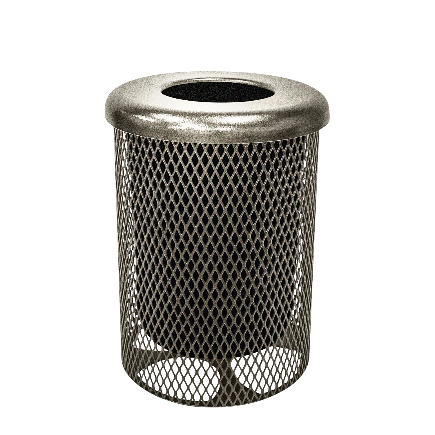 32-Gallon Heavy-Duty Expanded Metal Round Trash Receptacle, Commercial Outdoor Waste Bin with Liner & Black Flat Top Lid – Made in America (Textured Gold Vein)