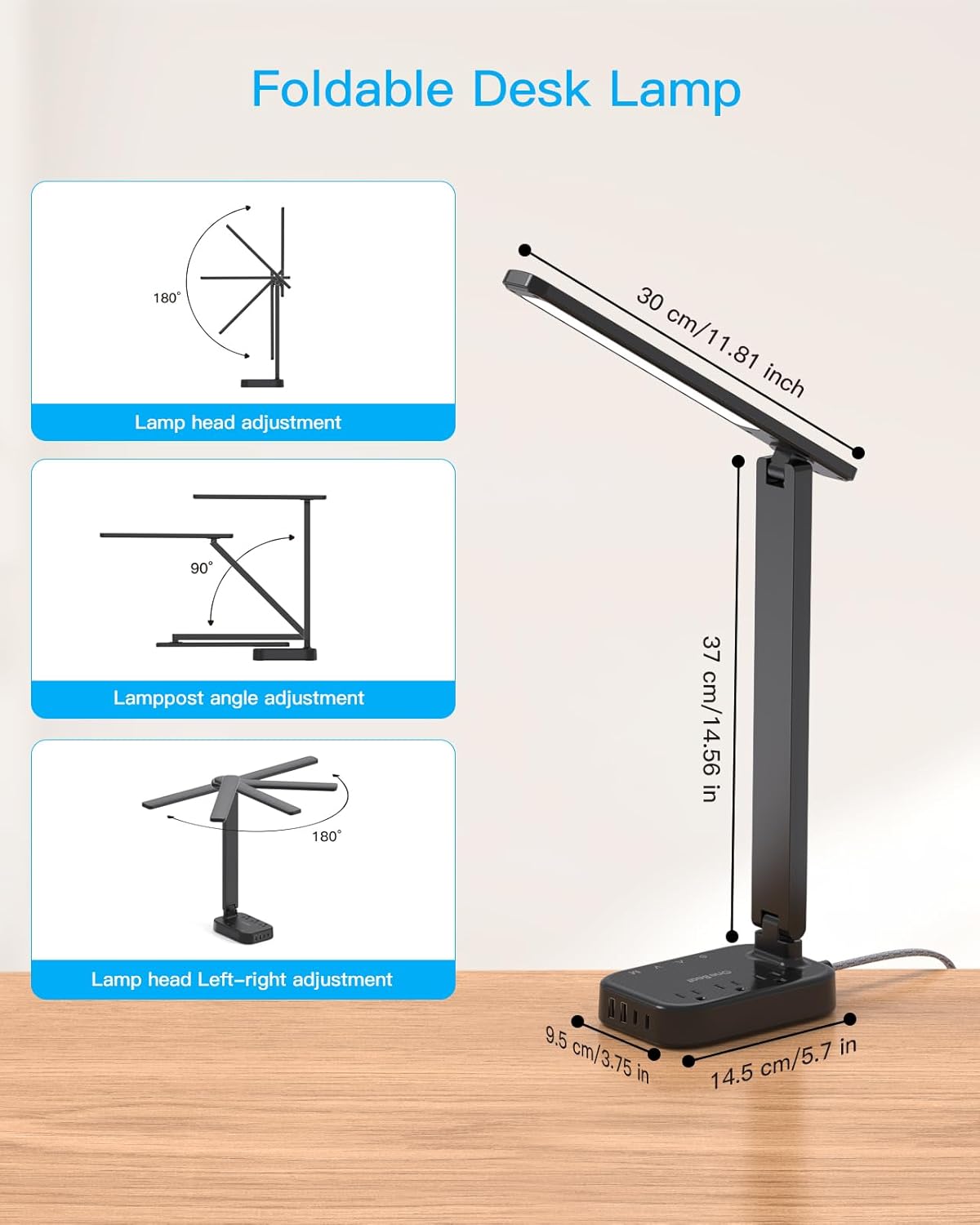 - γ Multi-Angle Adjustable Table Lamp γ - The led desk light head can 180Β° adjustable up and down, right and left, allowing you to fine-tune the light direction for greater lighting range and flexibility. With 90Β° foldable lamp arm, full foldable, small footprint, space saving.