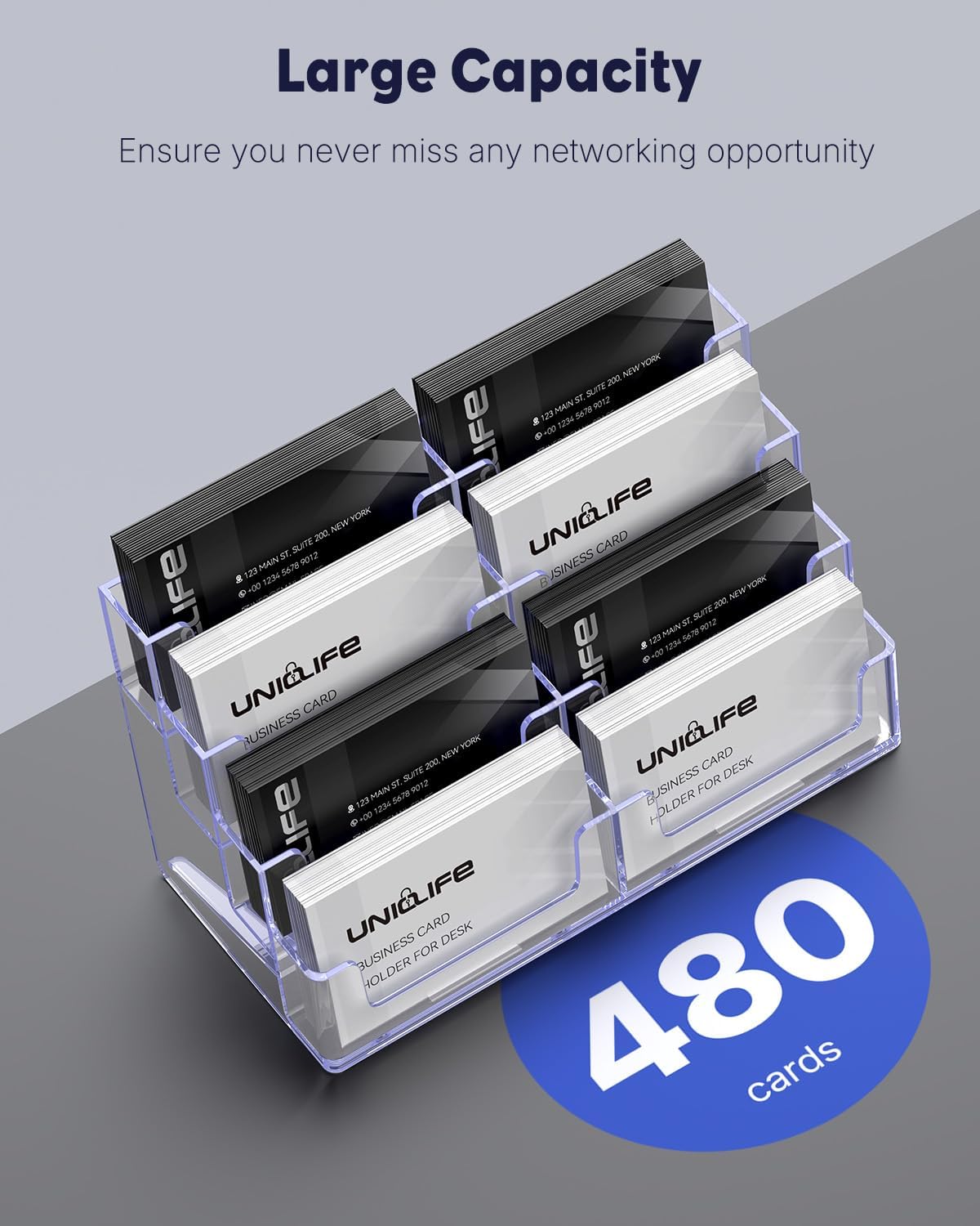 - Large Capacity: Size: 7.7" L x 3.3" W x 4" H. With 8 generous slots, each card stand accommodates up to 480 standard business cards. (NOTE: Capacity varies with card thickness.) Never miss a networking opportunity with ample card storage