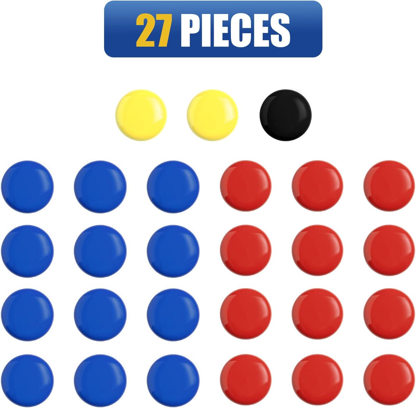 - Added Accessories: This set is made of high quality and durable materials. The 27-piece set includes 12 red, 12 Blue, for 2 teams and 2 Yellow and 1 black magnet for referee. Its good choice for replacement