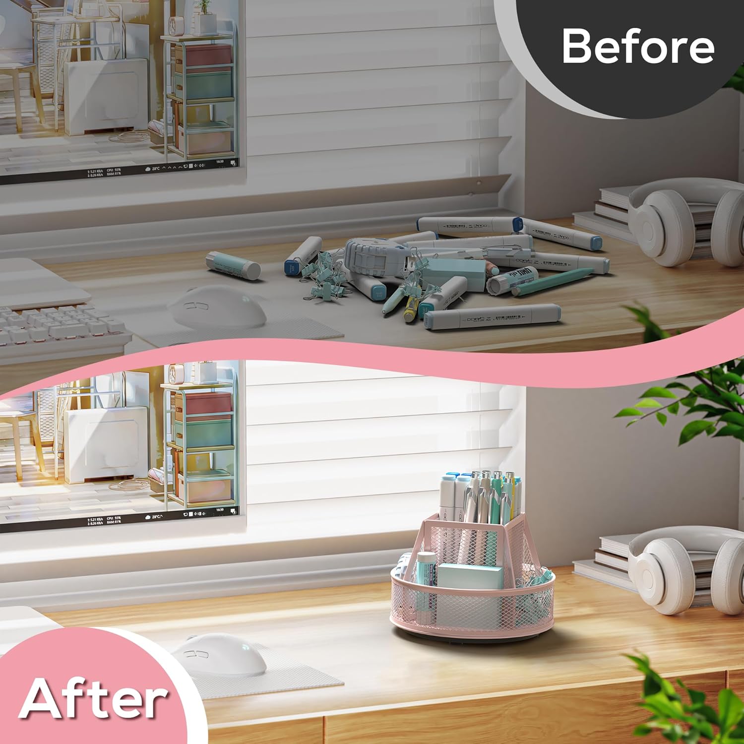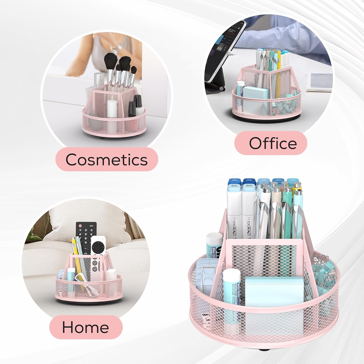 YINGHUA Metal Mesh Desk Organizer with 5 Compartments and Rotating Pencil Holder Pen and Stationery Organizer for Office Home School Anti Slip Base Pink