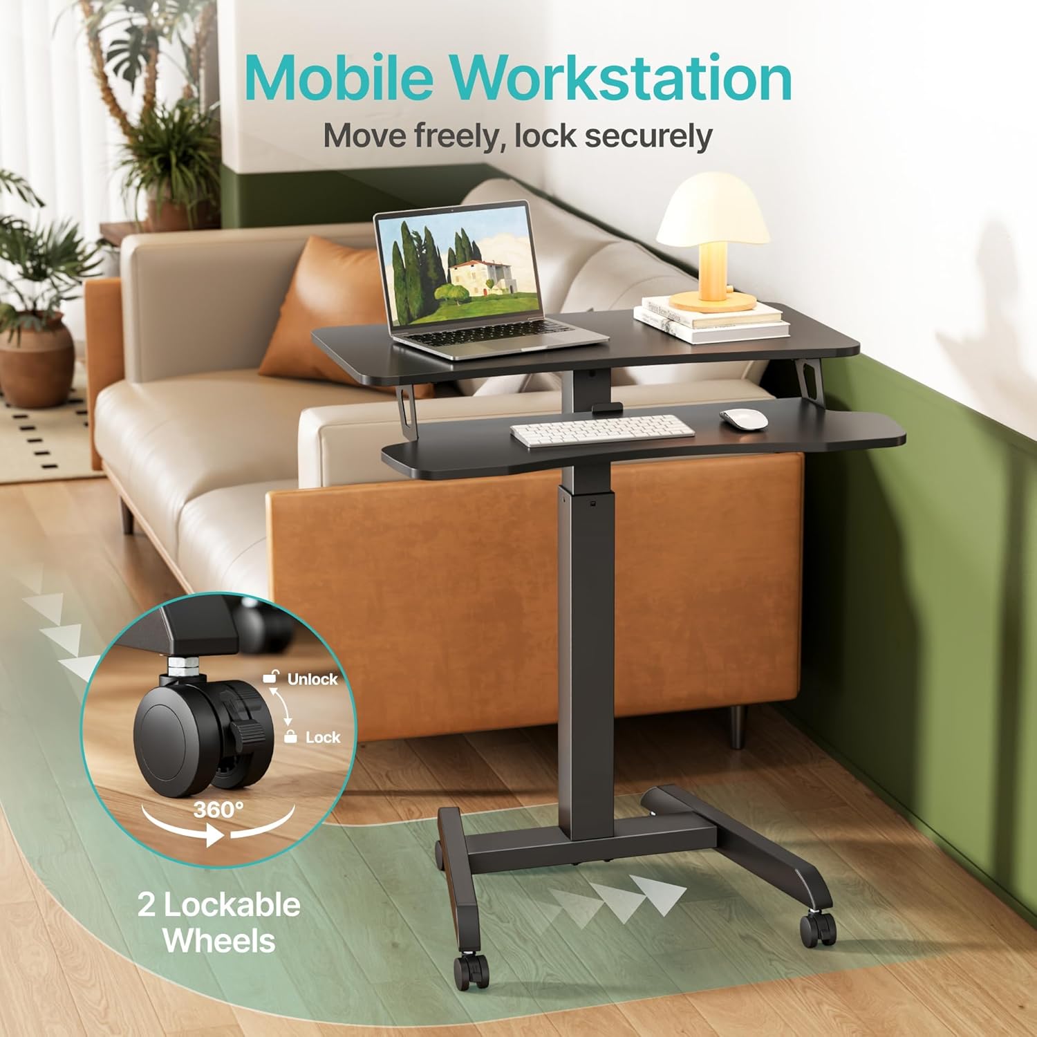 - 【Spacious Comfort Boost】This mobile laptop stand offers 30% more space than standard small desks, featuring a generous 31.2"L × 27.5"W tabletop. Whether you're using a laptop, taking notes, or keeping your favorite mug nearby, you'll have ample room to stay organized, reduce clutter, and maintain focus. After hours of sitting, effortlessly raise your adjustable table with wheels up to 47.2 inches. This rolling desk can serve as an extension to other desktops whenever needed.