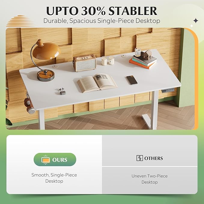 - Hassle-Free Assembly: The electric standing desk includes detailed instructions for streamlined installation. One-piece desktop requires less steps than joined desktops to save time and effort. Please contact our U.S.-based product support team if you have questions about assembly or product selection.