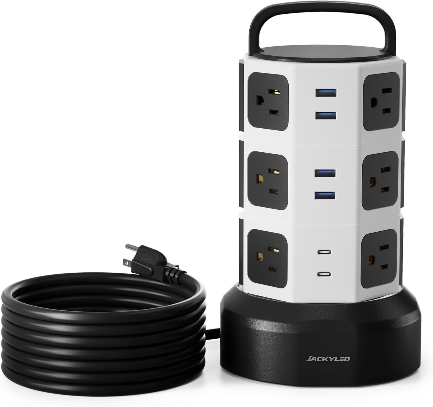 Power Strip Tower Surge Protector, JACKYLED 1625W 13A Outlet Surge Electric Tower, 12 Outlets 6 USB Ports Charging Station with 16AWG 15ft Heavy Duty Extension Cord for Home Office Dorm