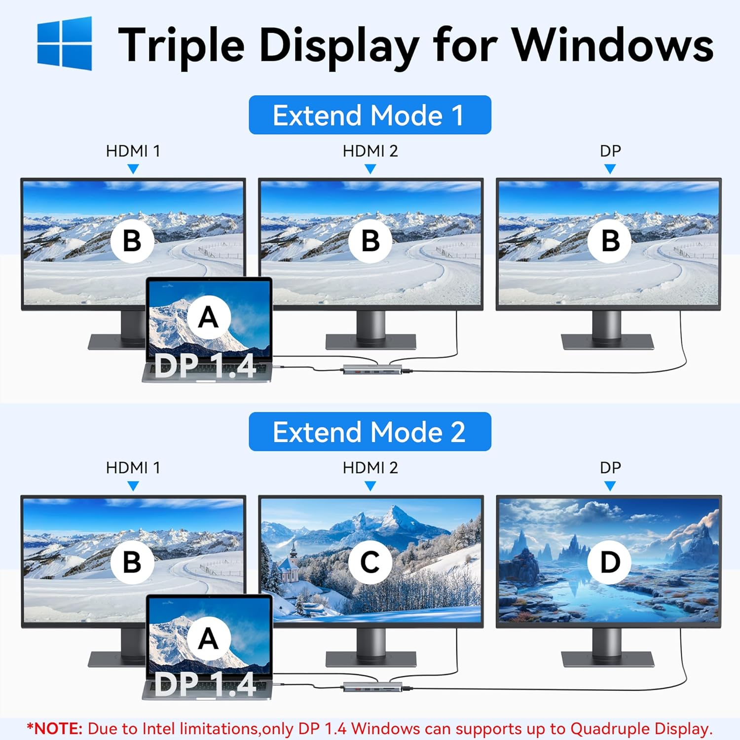 - γUSB C Docking Station Triple DisplayγThis USB C docking station dual monitor connects via a single USB-C/Thunderbolt 3 port, driving 3 monitors (2x 4K HDMI + 1x 4K DP). While single use HDMI 1 port or displayport resolution up to 4K@60Hz, single use HDMI2 resolution up to 4K@30Hz. Dual monitors will be 4K@30Hz and 1080P@60Hz(DP1.4). Triple monitors will be 1080P(DP1.4).Windows supports extended mode via MST/SST; MacOS mirroring only. Ideal docking station for laptop multi-display workflows