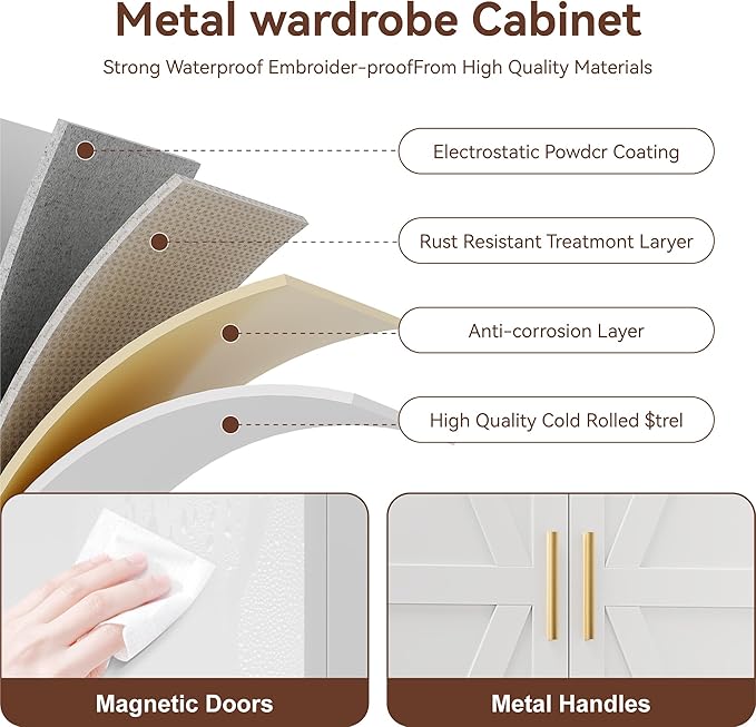 - Rustic Farmhouse Design: The door panels of this metal wardrobe feature a charming farmhouse design, blending traditional elegance with modern practicality. The aesthetic appeal of the cabinet makes it both a functional and decorative piece
