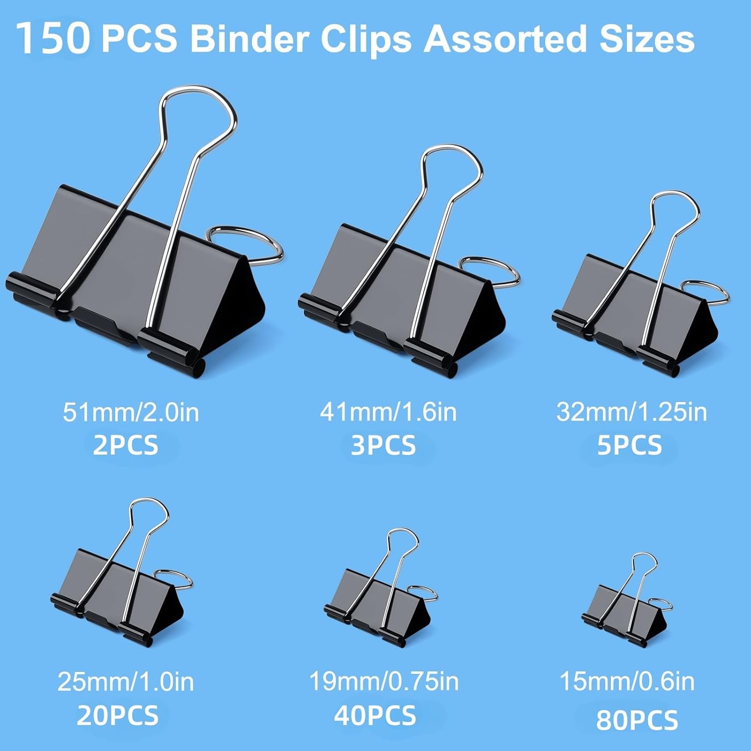 - Binder Clips Size : 2 inch x 2 pcs, 1.6 inch x 3 pcs, 1.25 inch x 5 pcs, 1 inch x 20pcs, 0.75 inch x 40 pcs, 0.6 inch x 80 pcs, assorted size total 150 pcs binder clips kit can meet your different using needs.