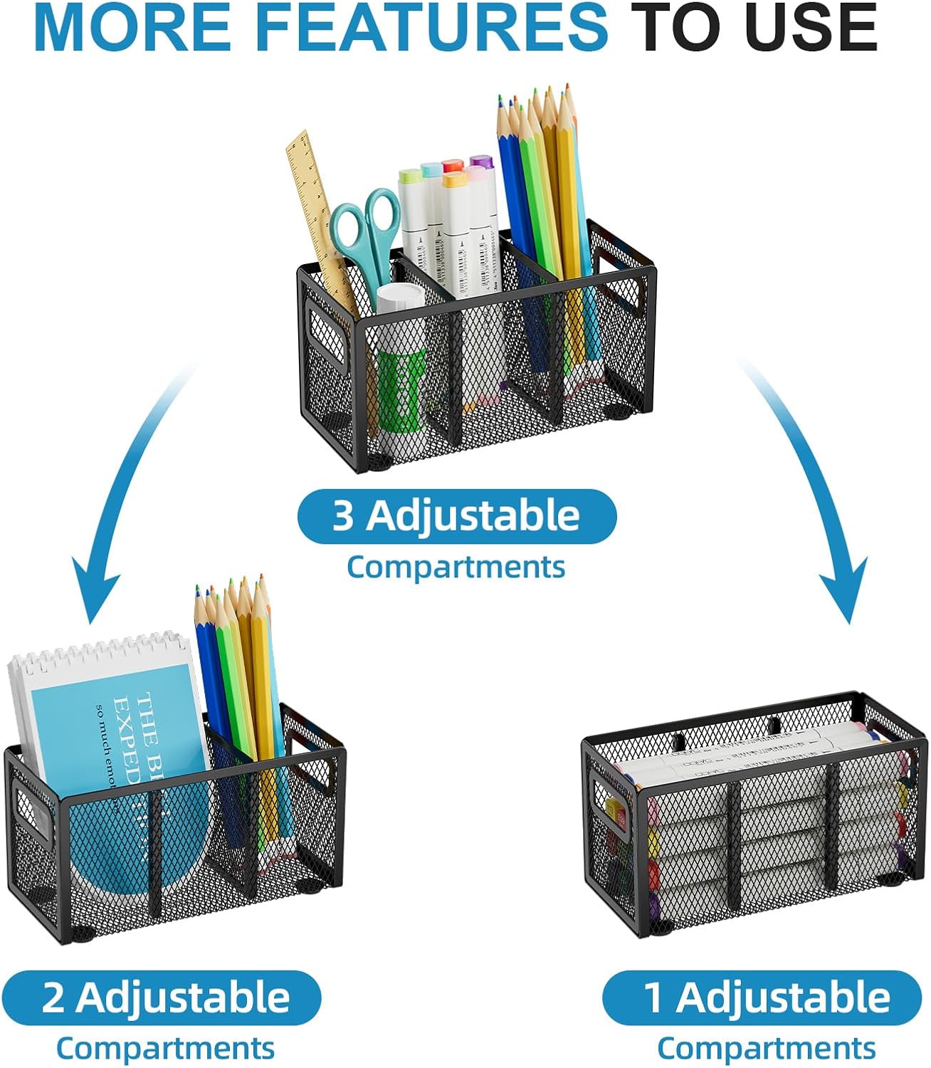 Marbrasse Mesh Pen Holder for Desk,Pencil Holder Desk Organizer 3 Adjustable Compartments,Pencil Cup with Handle Perfect for Classroom, Office, Home,Makeup,Art (Black)