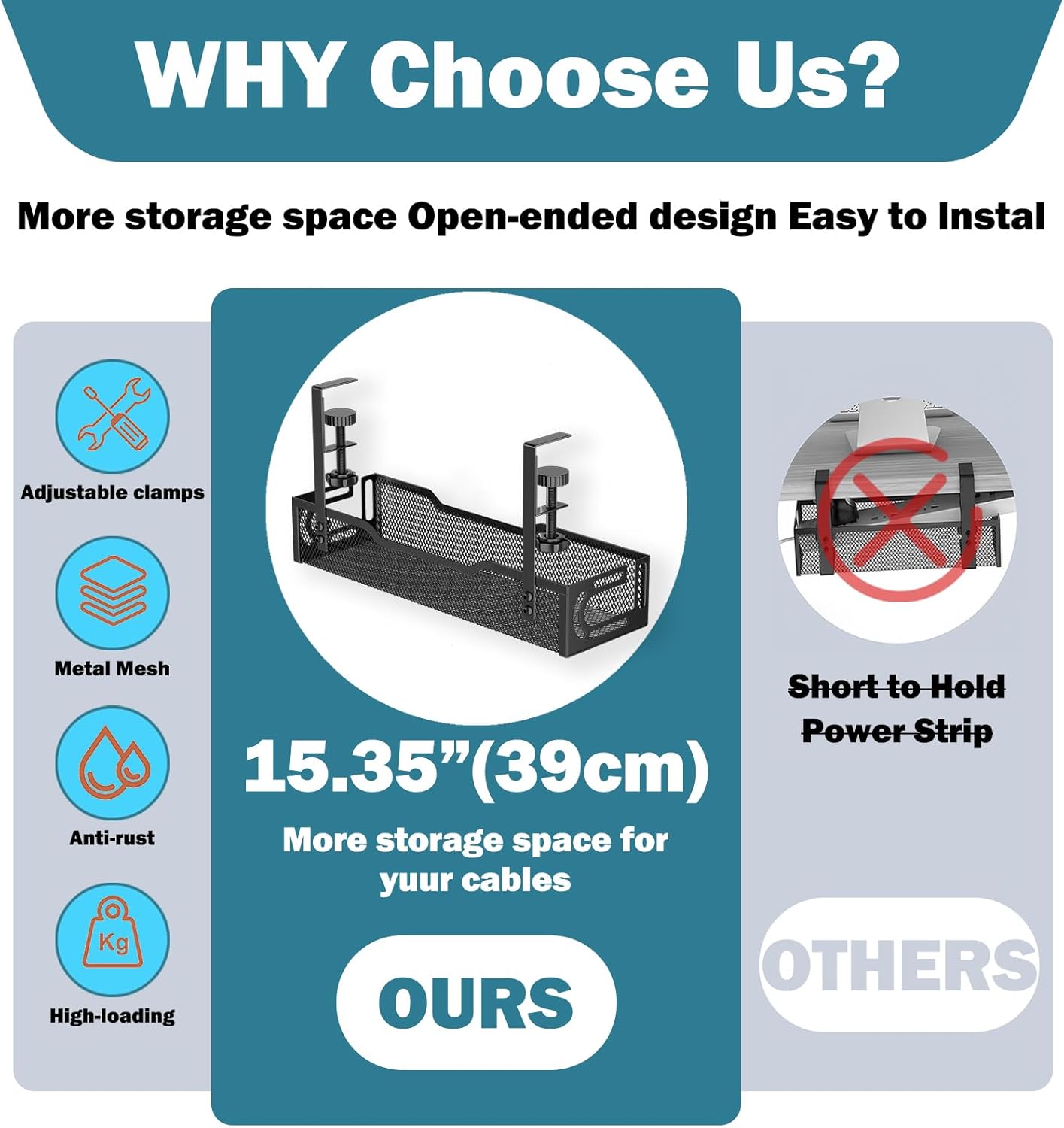 - 【No-Drill Installation & Universal Compatibility】Achieve seamless cable management under desk without drilling or damaging your workspace. Supporting inward or outward mounting. Our under desk cable management tray features adjustable clamps (0.4"-2.2" thickness) that securely attach to wood, glass, metal or standing desks. Ideal for renters or multi-material setups, it leaves no marks and allows effortless.