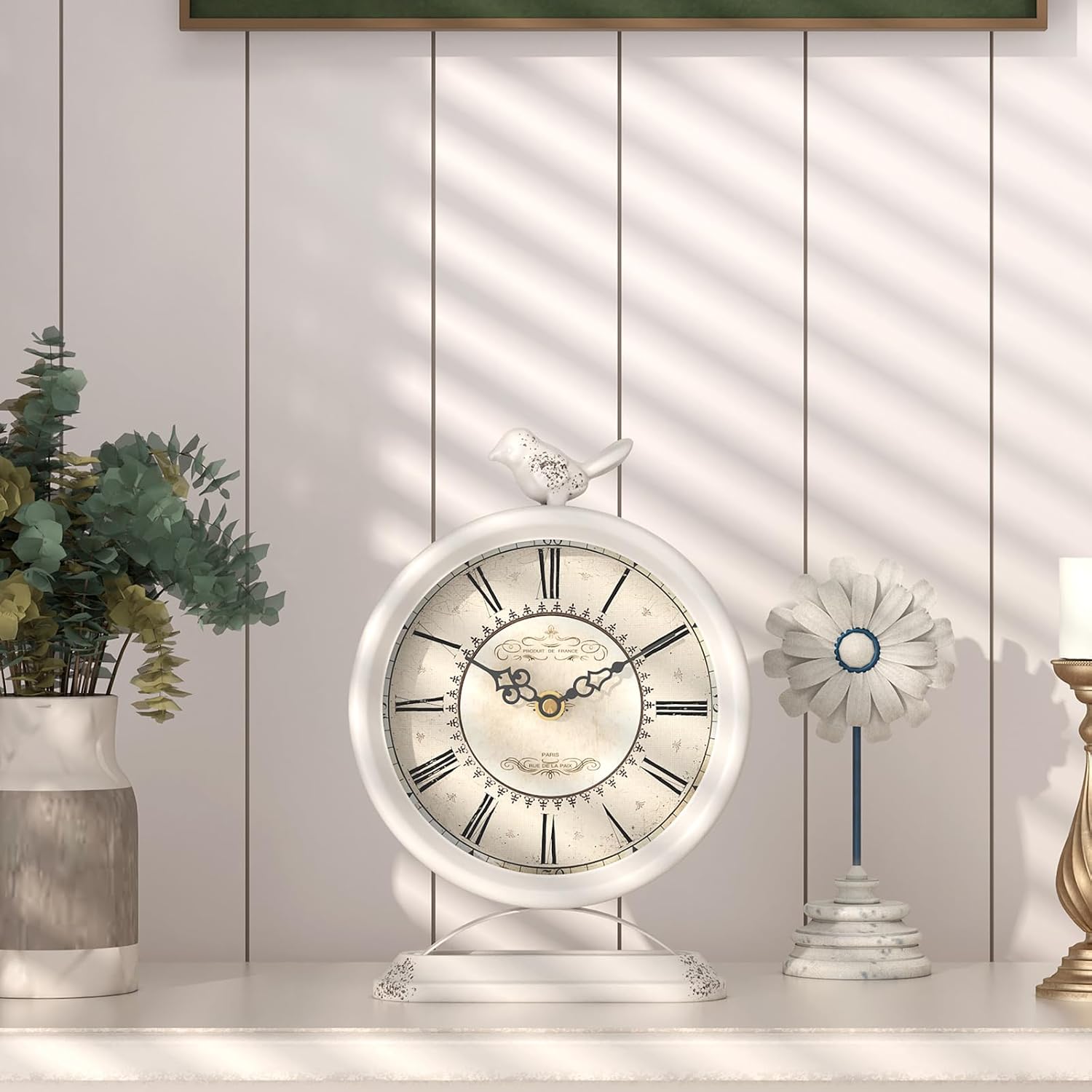 Vintage Table Clock with Bird, European Antique Style White Mantel Clocks, Desk and Shelf Decor Clock, for Farmhouse, Bedside, Living Room, Bedroom, Gift (9" H x 6.5" W)