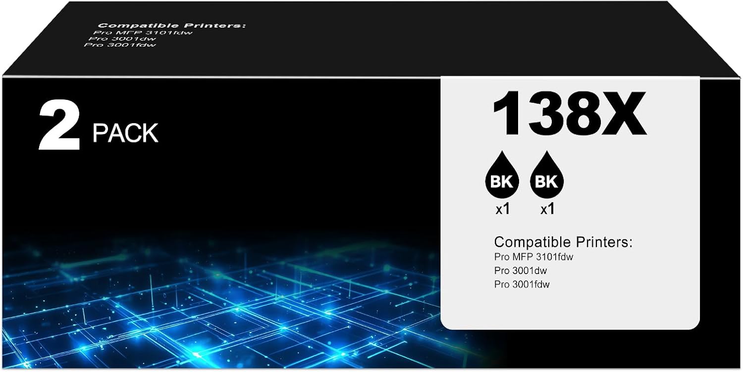 - Compatible for HP 138X Black Toner Cartridges 2 Pack Printer ModelοΌfor hp 138X black Toner Cartridges Compatible for hp color Laser pro mfp 3101fdw toner, color Laser pro 3001dw toner, Laser Pro MFP 3101sdw, color Laser pro 3001fdw toner