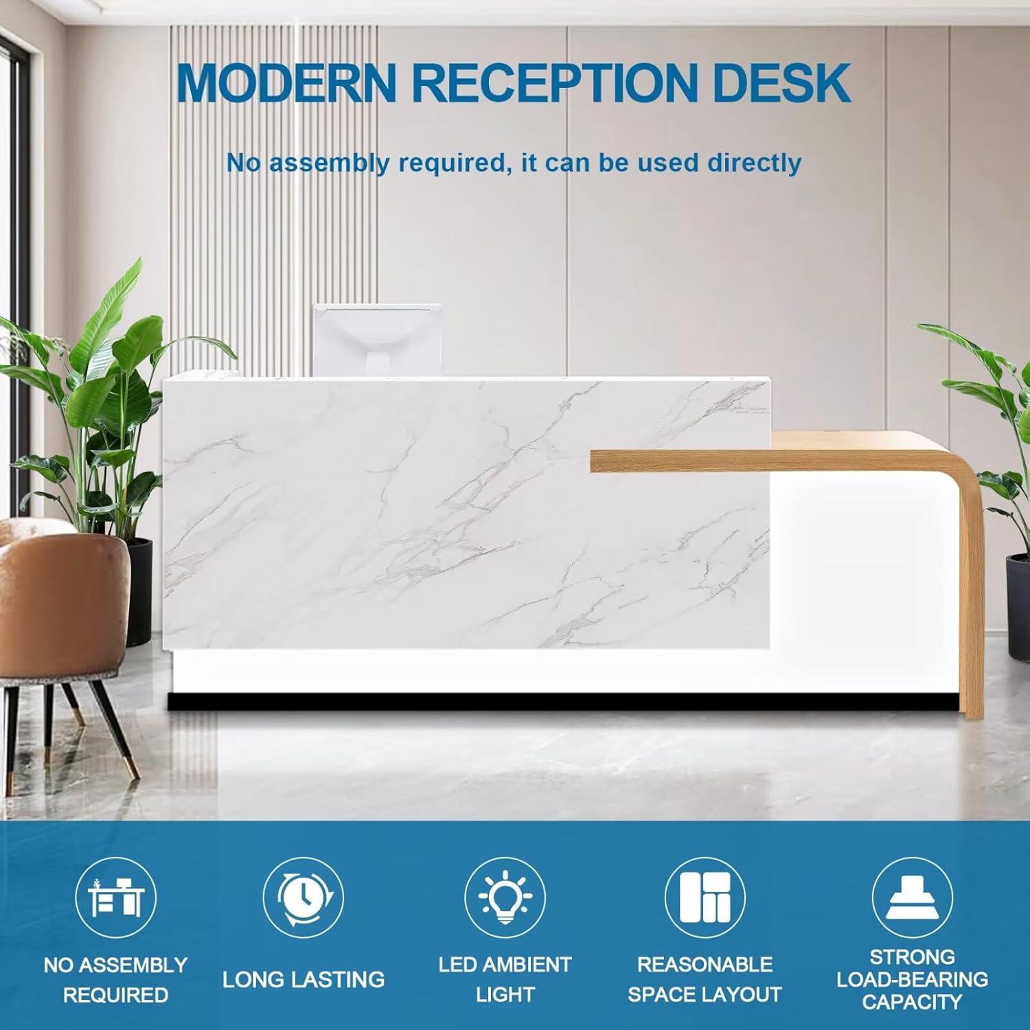 - LED Light Strips: The front desk reception counter cashier counter check out counter LED ambient light strips on the reception counter reception desk with storage are bright, and through the means of color coordination, it can convey an artistic visual effect, which is eye-catching