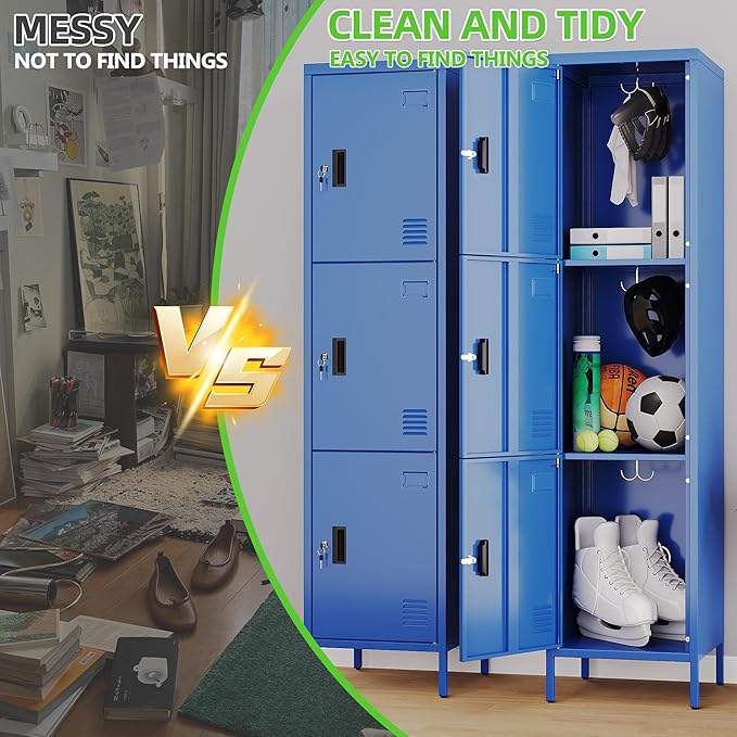 - Sleek Blue Aesthetic:This 3 door metal storage locker in a stylish blue color not only offers secure storage but also adds a modern touch to any home, office, or gym environment. With dimensions of 66.18"H×15.75"W×15.75"D, it provides ample space without taking up too much floor area.