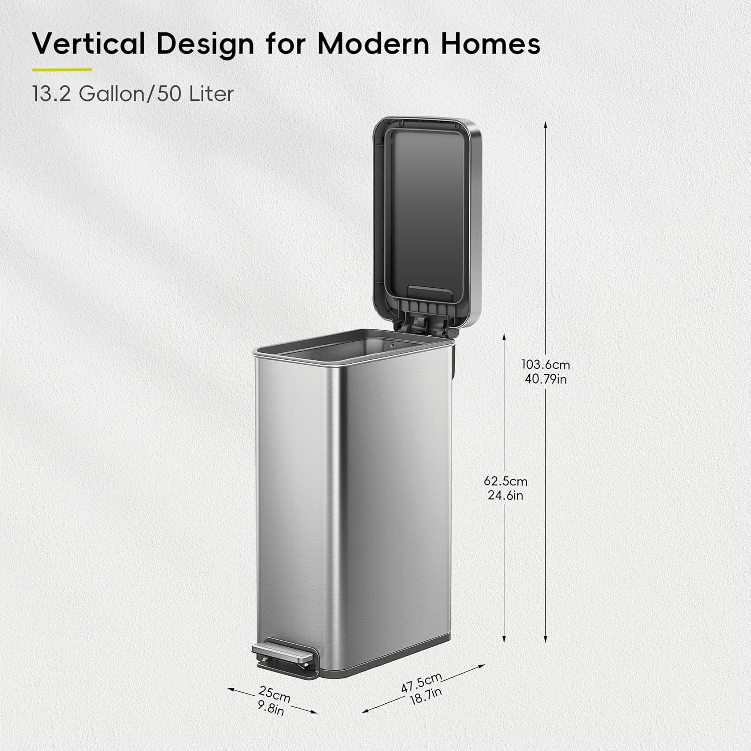 EKO Hudson Slim 50L / 13.2 Gallon Kitchen Trash Can with Lid, Stainless Steel Step Garbage Can for Kitchen or Home, Space-Saving Garbage Can with Soft Close Lid, Stay-Open, Liner Ring, Handle
