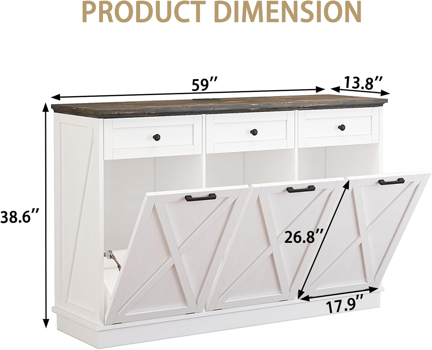 Farmhouse Tilt Out Trash Cabinet, Triple 13 Gallon Wooden Kitchen Trash Can Cabinet with Hideaway Drawer, Freestanding Garbage Recycling Cabinets, Pet Proof, Power Outlets, 59 Inch, White