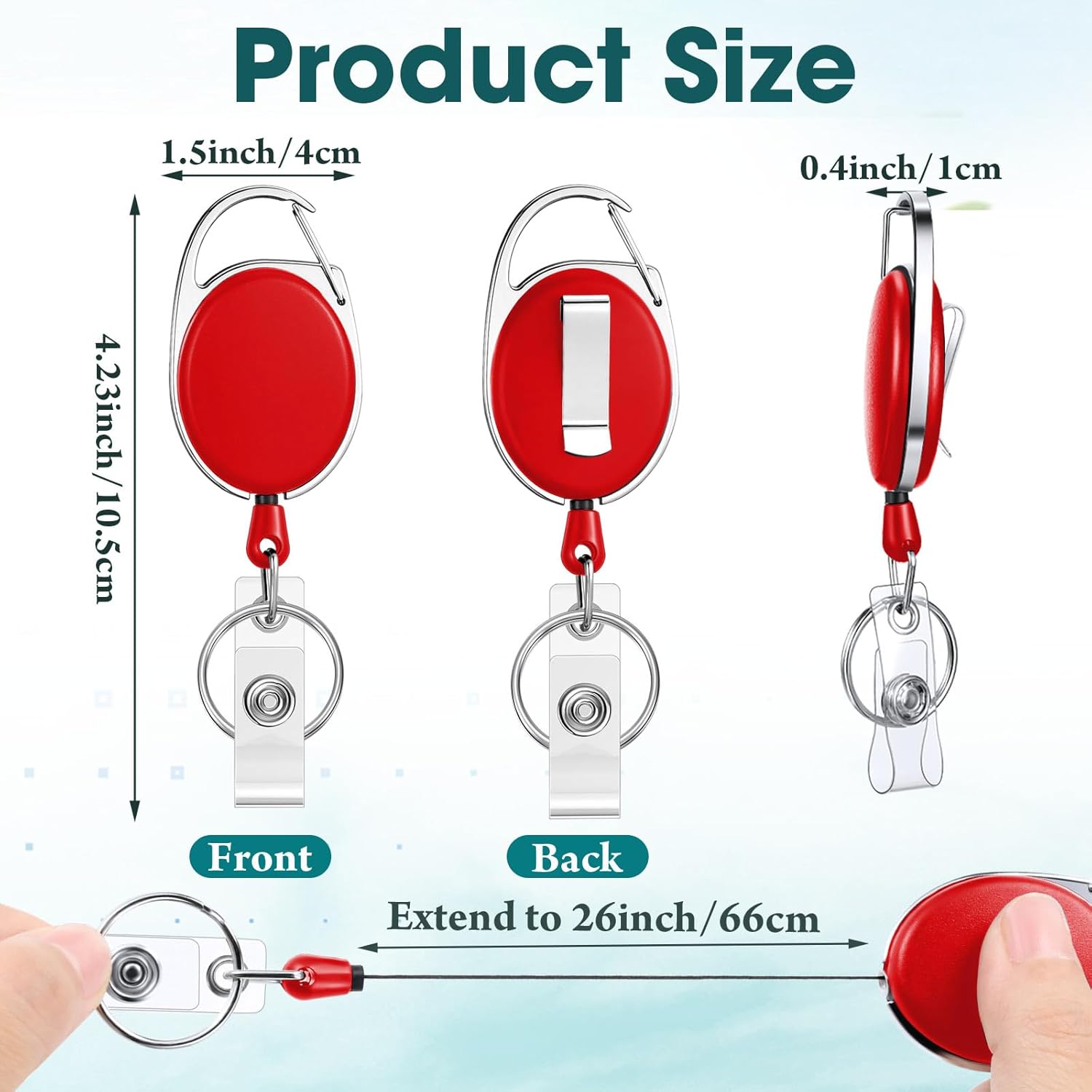 - Size: retractable keychain size is 4.13 x 1.57 inch/ 10.5 x 4 cm, designed with a retractable cord, can extend up to 26 inch/ 66 cm long, the retraction mechanism is smooth, will not get stuck, and not easy to break, easy to enter and exit various places