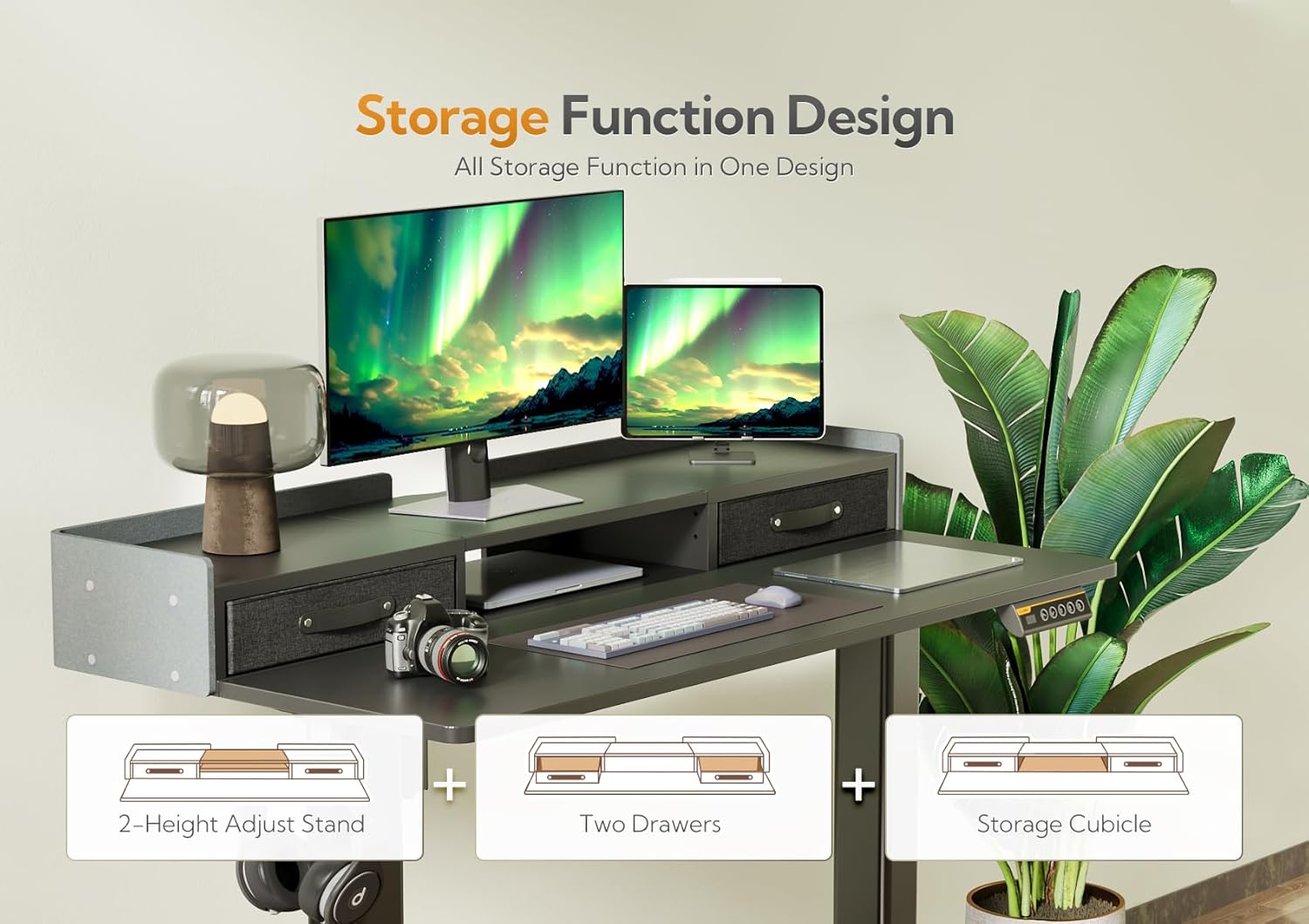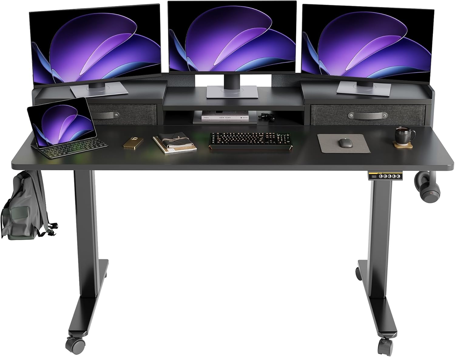 - 2-Drawers for Storage - Adjustable stand desk with drawers. 2 tabletop drawers provide more storage & organize space for a variety of home office tasks. The desk comes with a hook, drawers, and felt fence, which provides more home office desk usage possibilities.
