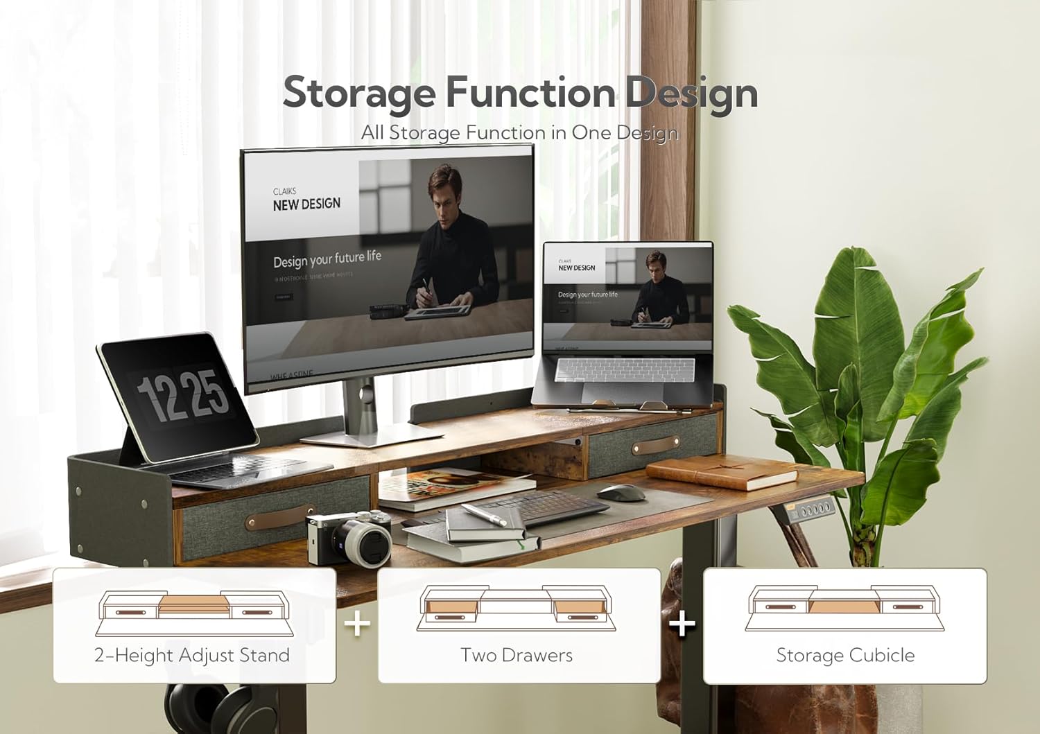 - 2-Drawers for Storage - Adjustable stand desk with drawers. 2 tabletop drawers provide more storage & organize space for a variety of home office tasks. The desk comes with a hook, drawers, and felt fence, which provides more home office desk usage possibilities.