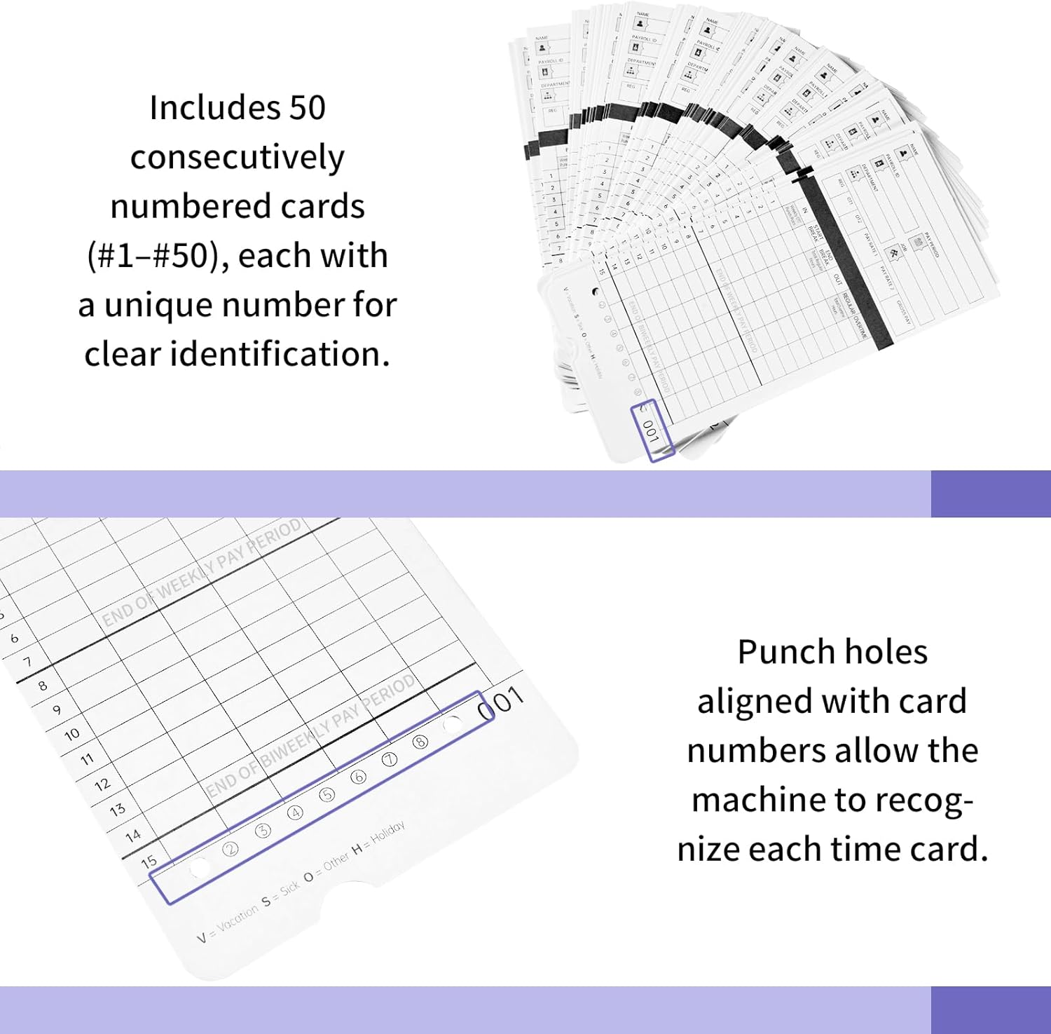 - 300 Time Cards with Organized Numbering Includes 300 employee time cards, packed in 6 individual boxes (50 cards per box), numbered from #1β#50 in each. Helps avoid duplicate entries and improves organization for any time card machine setup.