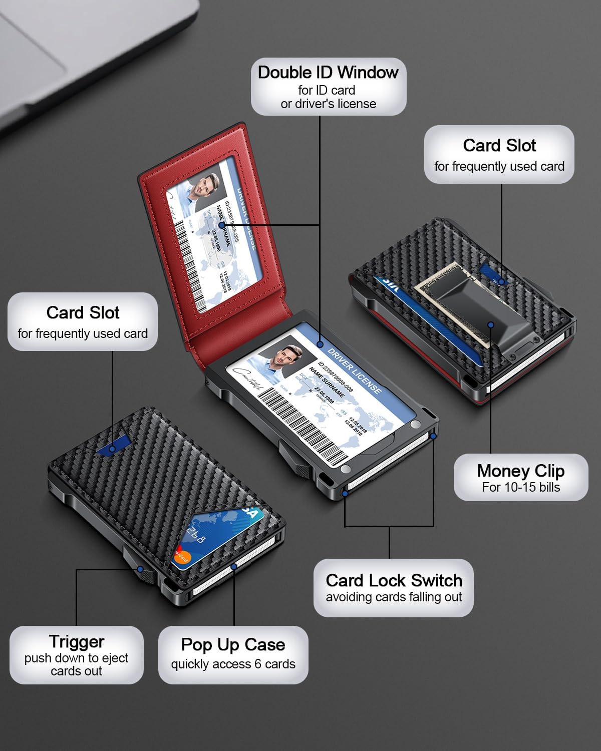 - DOUBLE ID WINDOWS: KAFELLON designed the first pop up wallet on the market with 2 ID windows, based on real user needs. It's perfect for holding your ID and driver's license for quick access and quick view.