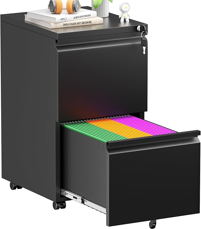 Superday 2 Drawer File Cabinet, Metal Rolling Filing Cabinet with Lock, Small File Cabinets with 2 Drawer, Filing Cabinets for Home Office Fit A4/Letter/Legal, Easy Assemble, Black