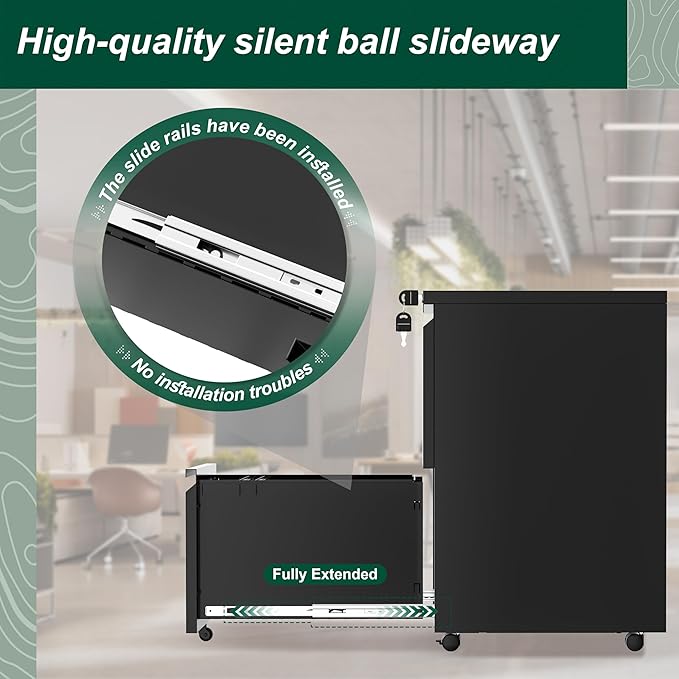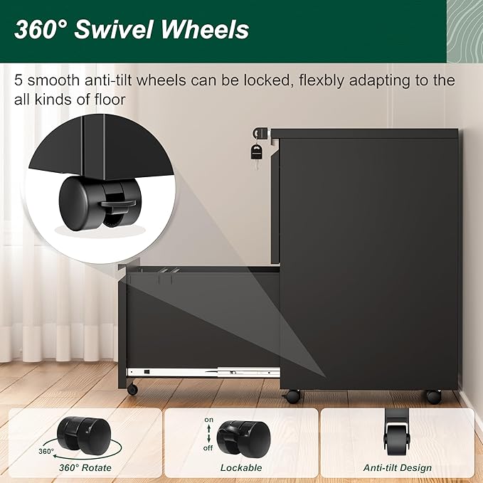 - ❤Mobile File Cabinet -- This mobile filing cabinet is equipped with five rubber wheels, so you don't have to worry about the wheels scratching the floor. In particular, the front central caster to prevent tipping over. And four of the wheels can rotate 360 degrees for stability.